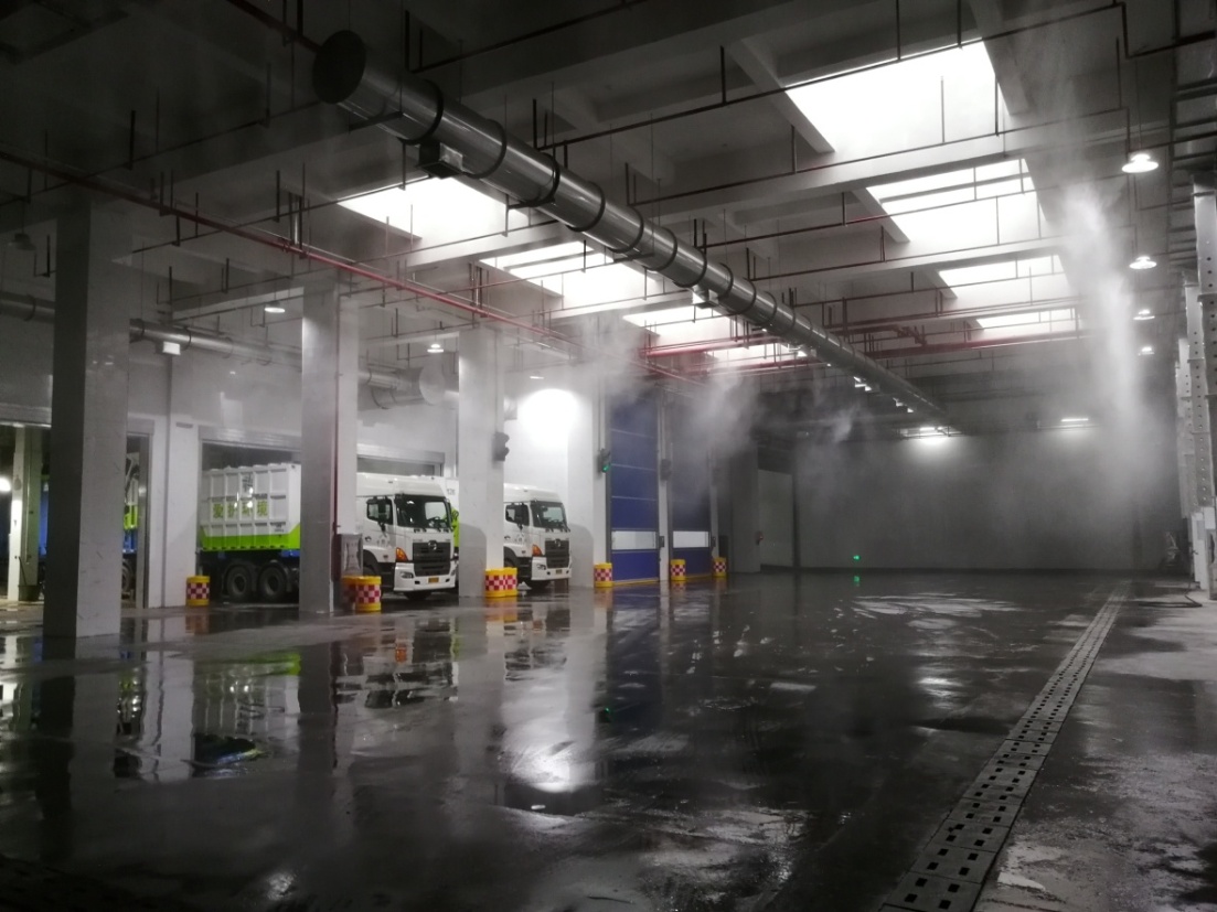 除装备本身密封性强之外,整个转运站卸料大厅、卸料口及转运大厅,引入了负压抽风除尘除臭系统和空间喷淋除臭系统,全方位除尘除臭。